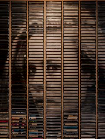 Die Kassettenregale von Gregor Hildebrandt spiegeln das unstillbare Interesse des Künstlers an Musik und Kino wider. Diese Werke sind von den Regalen inspiriert, die während des goldenen Zeitalters der analogen Medien üblicherweise zur Aufbewahrung von Kassetten verwendet wurden. Sie stellen Gemälde oder Porträts dar, die ausgeschnitten und dann auf die Kassetten geklebt wurden. Das Werk "Robin Wright" zeigt ein Porträt der amerikanischen Schauspielerin Robin Wright. Durch das Freilegen einiger Kassetteneinlagen geben die Ausschnitte einen Zugang zu dem Musikarchiv frei, das sich metaphorisch in dem Regal befindet.