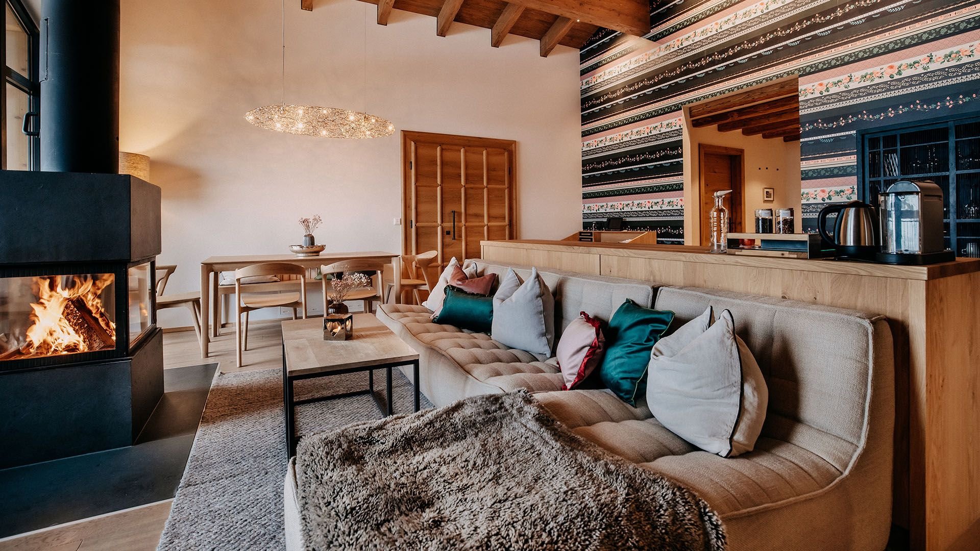 - Wohnbereich mit Sofalandschaft und offenem Kamin
